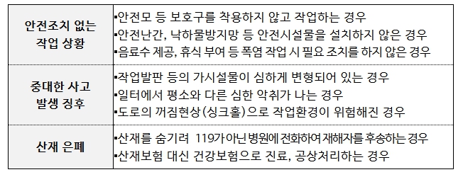 이번에 개설되는 「안전일터 신고센터」에는 ①안전조치 없이 이루어지는 작업 상황, ②붕괴·화재·누출 등 다수의 인명피해가 발생할 수 있는 중대한 사고 징후가 있는 경우, ③산업재해 발생 사실을 숨기려고 하는 경우(산재 은폐)에 대해 신고할 수 있다. 노동자 본인이 이러한 상황에 처해 있는 경우는 물론, 일반 시민이 위험한 상황을 발견한 경우에도 신고가 가능하다.