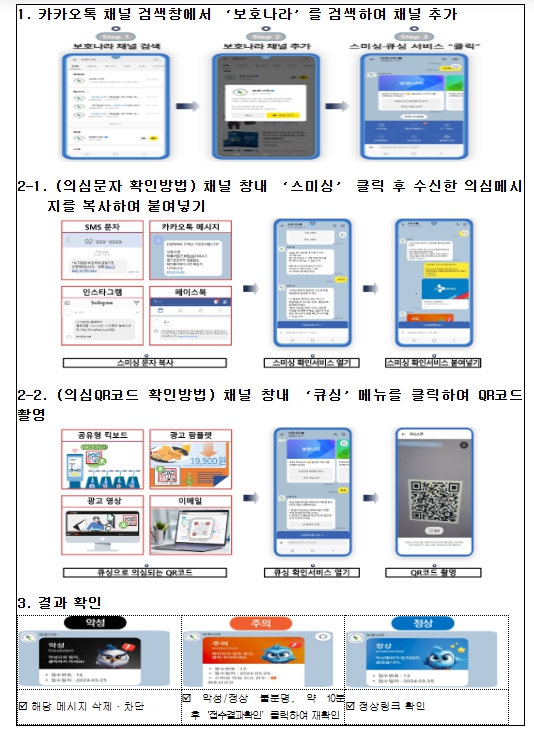 인터넷주소를 포함하고 있는 의심스러운 문자를 받은 경우에는 카카오톡 ‘보호나라’ 채널을 실행한 후 해당 문자를 복사‧붙여넣기 해서 정상 문자인지 여부를 확인할 수도 있다.