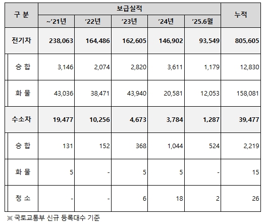 2025년 6월 누적 기준으로 전기‧수소차는 약 84.5만대가 보급됐으며, 2023년 이후 다소 둔화됐던 전기차 보급 수요는 올해 들어 회복세를 보이고 있다. 환경개선 효과가 큰 전기‧수소 버스는 수요 둔화 없이 지속적인 증가세를 유지하고 있으며, 2011년부터 2025년 6월까지 국내에 보급된 전기버스 12,830대 가운데 국산은 59.6%, 수입산은 40.4%를 차지한다.