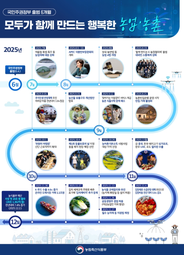 송미령 장관은 “지난 6개월 간 ‘희망을 실현하는 농업·농촌’을 만들기 위해 노력했고 일부 성과도 있지만, 아직 채워나가야 할 부분도 많은 것 같다.”고 하면서 “올해 계획했던 일들은 신속하게 마무리하고, 보완이 필요한 부분들은 내년도 계획에 반영하여 현장에서 국민주권 정부의 변화를 체감하고, 농업·농촌에 온기를 불어 넣을 수 있도록 전력을 다하겠다.”고 밝혔다.