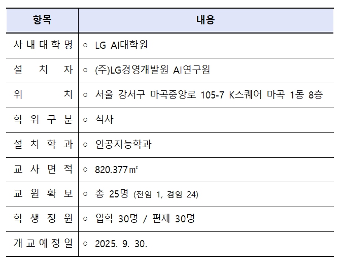 이번에 교육부가 인가한 엘지(LG) 에이아이(AI)대학원은 국내 최초로 설치되는 사내대학원으로 ‘도메인(domain) 지식과 인공지능(AI) 역량을 갖춘 최고의 인공지능(AI) 인재 양성’을 목표로 9월 30일에 개교한다. 개교 후 인공지능학과 석사학위 과정 입학생 30명을 모집하고 내년 3월부터 교육과정을 본격적으로 운영할 예정이다. 이를 통해 기업의 혁신 역량 제고뿐만 아니라 인공지능이 첨단산업 발전과 미래 성장 동력을 제고하는 데에 일조할 것으로 기대된다.