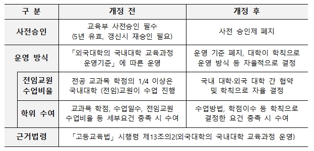 기존에는 국내 대학이 프랜차이즈를 운영하기 위해서 교육부의 사전 승인을 받아야 했으나, 2024년 2월 고등교육법 시행령 개정으로 대학 간 협약만으로도 운영이 가능해졌다. 교육과정의 구성과 수업 운영도 각 대학이 학칙으로 자율적으로 정할 수 있게 되어 현장에서 ‘프랜차이즈’ 운영의 추진력이 높아졌다.