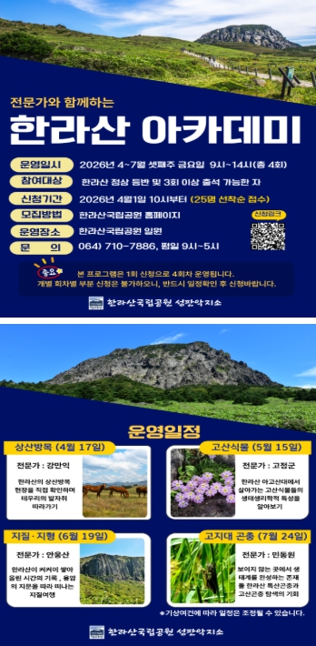 상반기 프로그램은 오는 4월 1일 오전 10시부터 한라산국립공원 누리집(홈페이지) ‘프로그램 예약’에서 25명 선착순으로 접수한다. 참여 대상은 한라산 정상 등반이 가능한 체력을 갖추고, 전 과정을 성실히 참여할 수 있는 도민이면 누구나 가능하다.
