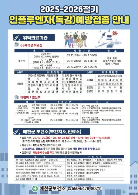예천군은 군민 중 △14~18세 청소년(2007~2011년생) △19~64세 중증 장애인(1961~2006년생) △19~64세 국가유공자 및 배우자(1961~2006년생) △19~64세 기초생활수급자(1961~2011년생) △13세(2012년생) 이하 아동이 속한 두 자녀 이상 가구 △ 조류 사육자(가금 100수 이상) 및 배우자, 종사자를 대상으로 무료 접종을 시행한다.