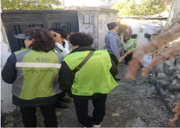 성북동은 재개발 구역이 밀집해 있고 고지대·구릉지가 많은 지역 특성상 위험시설물이 산재해 있다. 이에 동주민센터는 자율방재단, 마을안전협의회 등 주민 조직과 관할 파출소, 재개발구역 추진위원회가 참여하는 민·관·경 연합 순찰체계를 구축했다. 순찰단은 7월부터 11월까지 총 11회에 걸쳐 지역 내 위험시설물 162개소를 점검했다.