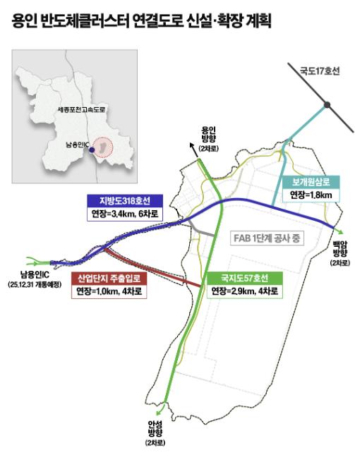 시는 대한민국 반도체 메가 클러스터의 핵심 시설인 용인반도체클러스터의 원활한 교통 여건을 조성하기 위해 현재 2차로인 지방도 318호선을 6차로로 확장(3.4km)하는 것을 비롯해, 국지도 57호선 2차로→4차로 확장 및 선형 변경(2.9km), 보개원삼로 2차로→4차로 확장(1.8km), 산업단지 주출입도로 4차로 신설(1km) 등의 공사를 진행하고 있다.