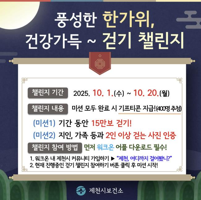 보건소 관계자는 “추석 연휴 동안 활동량은 줄고 과식하기 쉬워 건강관리에 소홀해지기 쉽다”며, “이번 걷기 챌린지를 통해 시민들이 일상 속 걷기를 실천하고 건강한 명절을 보내시길 바란다”고 말했다.