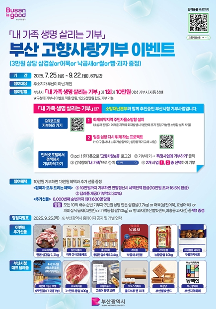 한편, 시는 7월 25일부터 9월 22일까지 '내 가족 생명 살리는 기부'라는 제목으로 '부산 고향사랑기부 이벤트'를 진행한다.