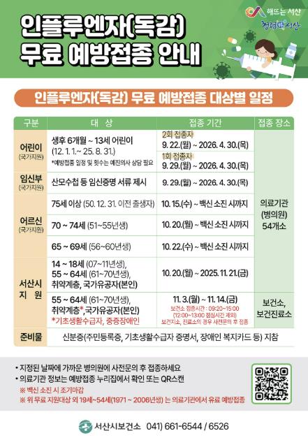 서산시 관계자는 “겨울철 건강관리를 위해 독감 유행 시기 도래 전 신속한 무료 예방접종으로 시민의 건강을 지키고자 한다”라며 “시민께서는 정해진 접종 일정에 맞춰 적극적으로 참여해 주시길 바란다”라고 말했다.