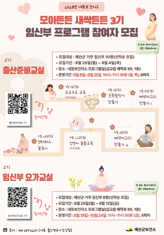 이번 하반기 프로그램은 임산부 대상 △출산준비교실(9월, 11월) △임산부 요가교실(9∼10월, 11∼12월)로 구성되며, 출산준비교실은 주 2회, 요가교실은 주 1회 내포 보건지소에서 각각 운영된다.
