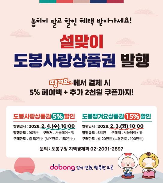 도봉사랑상품권은 오는 2월 4일 오후 4시부터 5% 할인된 금액으로 ‘서울페이플러스(서울페이+)’ 앱에서 구매할 수 있다. 1인당 월 50만 원까지 구매할 수 있으며, 보유 한도는 150만 원이다.
