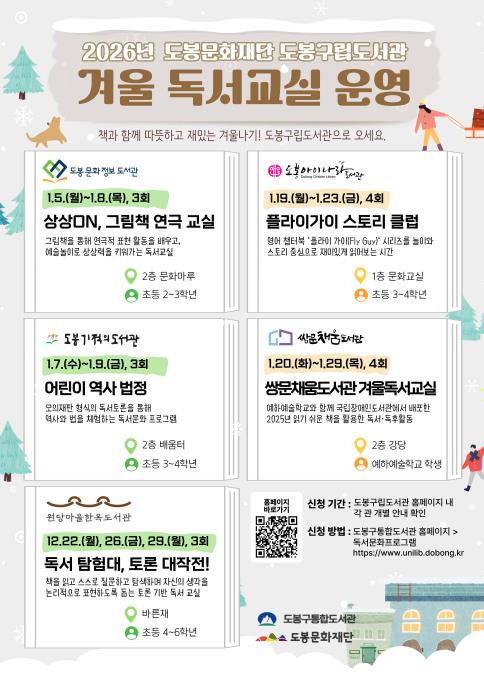 원당마을한옥도서관에서는 12월 22~29일 ‘독서 탐험대, 토론 대작전!’을, 도봉문화정보도서관에서는 1월 5~8일 ‘상상ON, 그림책 연극 교실’을, 도봉기적의도서관에서는 1월 7~9일 ‘어린이 역사 법정’ 프로그램을 운영한다.