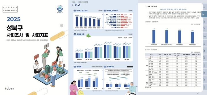 이번 성북구 사회조사 보고서에는 설문을 통해 조사한 11개 분야(△웰빙, △가족·가구, △소득·소비, △일자리, △보육·교육, △교통·환경, △주거·안전, △보건·복지, △문화·여가, △사회참여, △공공행정)와 행정자료를 활용한 1개 분야(△인구)를 포함해 총 12개 분야에 대한 주민 의견을 바탕으로 한 통계자료를 수록했다.