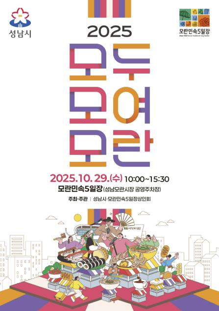 ‘2025 모두모여모란’ 행사장에서는 지역 가수들의 향토색 짙은 공연부터 성남시립예술단의 무대까지 전통과 현대가 어우러진 다채로운 공연이 펼쳐진다. 특히, 옛 시장의 정취를 재현한 전통예술 공연은 어르신들에게는 향수를, 젊은 세대에게는 색다른 문화 경험을 선사할 것으로 기대된다.
