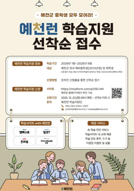황숙자 총무과장은 “예천런은 우수한 온라인 학습 콘텐츠를 지역 학생들이 활용할 수 있도록 전국에서 2번째로 시행하는 사업”이라며, “이번 추가 모집을 통해 더 많은 학생들이 자기주도학습 역량을 키울 수 있기를 기대한다”고 말했다.