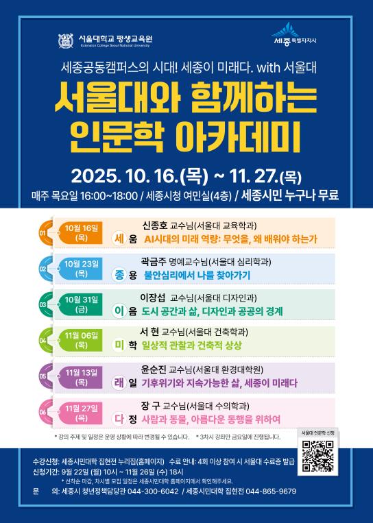 서울대학교 인문학 아카데미는 오는 11월 27일까지 매주 목요일(3차시만 금요일) 오후 4시부터 6시까지 세종시청 여민실에서 미래교육, 철학, 사회, 환경 등 다양한 주제로 총 6회에 걸쳐 운영된다.