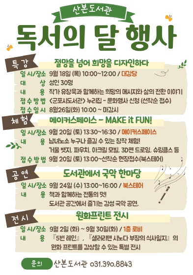 또한 9월 한달 동안 산본도서관 1층 로비에서는『5번 레인』,『샐러리맨 시노다 부장의 식사일지』등 문학동네 도서의 원화 프린트를 감상할 수 있는 전시도 마련된다.