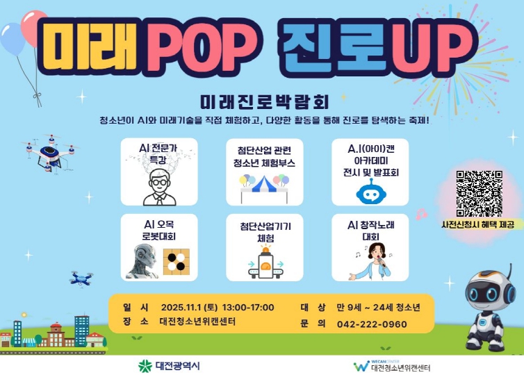 대전청소년위캔센터 주관으로 개최되는 이번 박람회는 대전 지역 청소년 및 일반 시민을 대상으로 AI 관련 체험 부스 운영, 전문가 특강, 경연 대회 등 미래 기술을 직접 경험할 수 있는 다채로운 프로그램으로 진행된다.