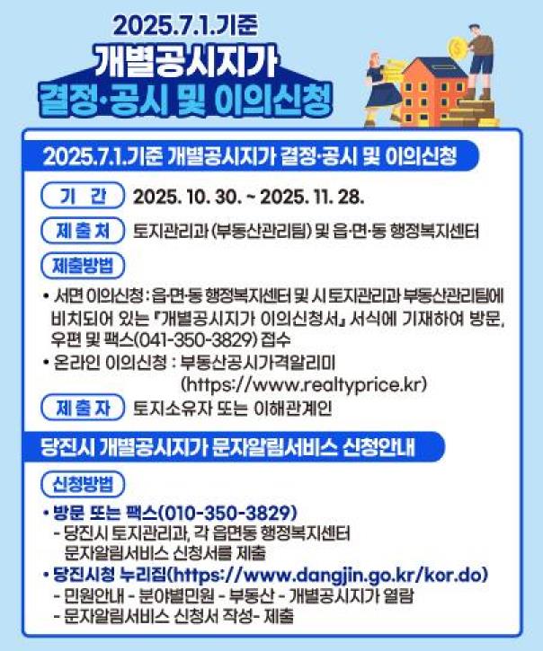 개별공시지가는 당진시청 토지관리과에 방문 또는 유선 문의하거나 인터넷 ‘부동산공시가격알리미’ 누리집에서 확인할 수 있으며, 11월 28일까지 토지소유자 및 이해관계자의 이의신청을 받는다.