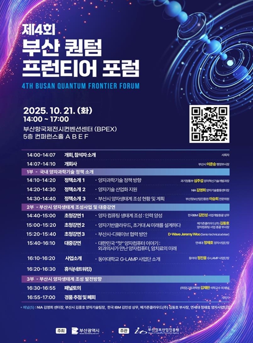 [부산시 양자 생태계 조성 사업 및 강연] ▲김민성 한국아이비엠(IBM) 사업개발총괄 상무의 ‘양자컴퓨팅 생태계 조성: 인력 양성’ ▲김동호 메가존클라우드㈜ 양자컴퓨팅 사업총괄 부사장의 ‘양자 기반 클라우드 초거대 인공지능(AI) 미래를 설계하다’ ▲제러미 우 디-웨이브(D-Wave) 수석 기술 고문의 ‘부산시, 디-웨이브(D-WAVE) 협력 방안’ ▲정재호 연세대학교 양자사업단장의 ‘대한민국 “첫” 양자컴퓨터 이야기 : ‘외과의사가 만난 양자컴퓨터, 암 치료의 미래’ 등을 주제로 진행된다.