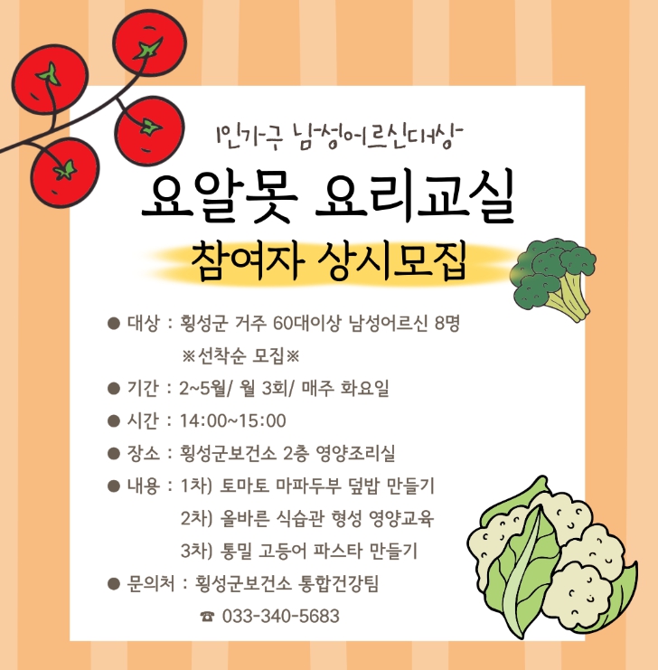 김영대 보건소장은 “이번 교육을 통해 혼자 사는 남성 어르신들이 스스로 건강한 식사를 준비할 수 있는 자신감을 갖고, 영양 불균형과 만성질환 예방에 도움을 받기를 기대한다”고 전했다.