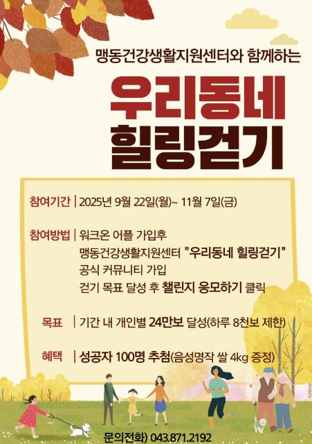 참여 희망자는 이달 8일부터 모바일 걷기 앱 ‘워크온(WalkOn)’을 설치하고 음성군 보건소 맹동건강생활지원센터 커뮤니티에 가입한 뒤, ‘우리동네 힐링걷기’ 챌린지를 예약·신청하면 된다.