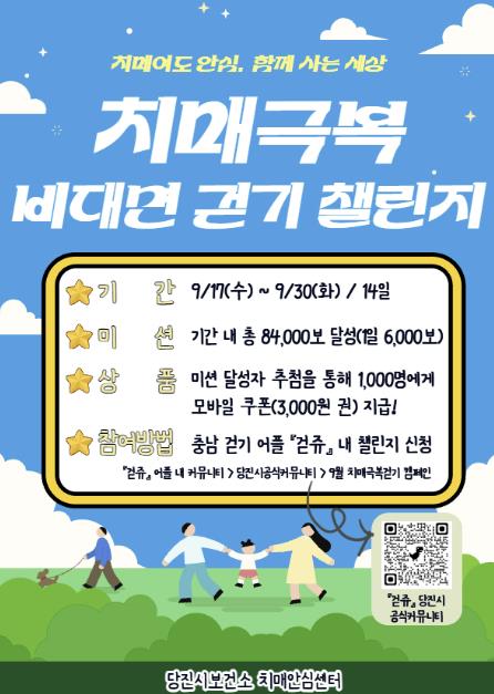 ‘치매여도 안심, 함께 사는 세상 치매극복 걷기 챌린지’는 모바일 '걷쥬' 앱을 통해 참여할 수 있다. 모바일 '걷쥬' 앱 내 당진시 공식 커뮤니티에 가입해 해당 챌린지를 신청한 후, 걷기 주간인 9월 17일~30일까지 14일간 8만 4000보 이상 달성하면 추첨을 통해 1,000명에게 소정의 상품을 증정한다.