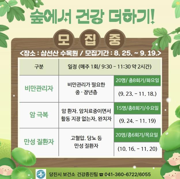 보건소 관계자는 “당진시 주요 사망 원인은 암과 심뇌혈관질환이며, 암 환자는 항암제·방사선 치료 과정에서 정신적 고통이 큰 만큼 심리 정서적 돌봄이 필요하다”며 “수목원의 산림치유가 정서적 안정과 신체적 회복에 도움이 되길 바라며, 비만 관리로 심뇌혈관질환을 조기에 예방할 수 있기를 기대한다”고 말했다.