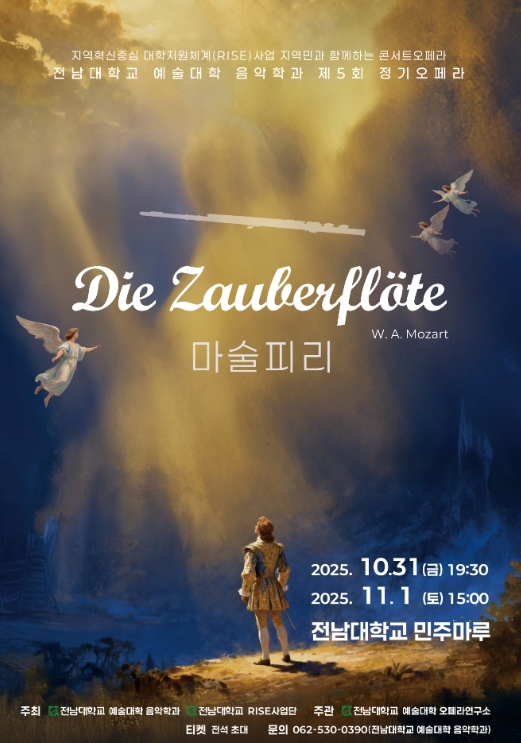 전남대 예술대학 음악학과는 오는 10월 31일 오후 7시 30분과 11월 1일 오후 3시, 전남대학교 민주마루에서 제5회 정기오페라 ‘마술피리’(Die Zauberflöte)를 무대에 올린다.