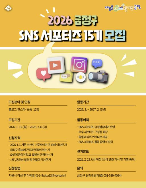 금정구는 오는 2월 6일까지 3개 분야(블로그, 인스타, 숏폼) SNS 서포터즈를 선발할 계획이라고 밝혔다.