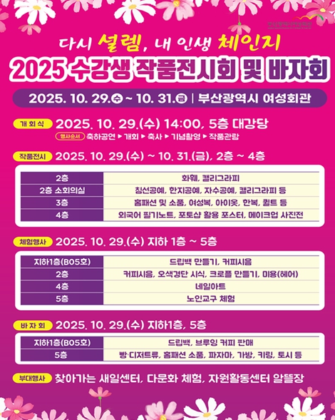 [전시회, 2~4층] 수강생들의 ▲작품 화훼 ▲조각보 ▲홈패션 ▲손 글씨(캘리그래피) 등 15종 300여 점을 행사 기간 3일 동안 전시할 예정이며, 시민 누구나 관람할 수 있다.