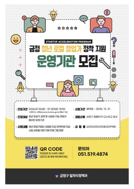 선정된 운영기관은 금정구에 있는 창업 7년 미만 청년(18~39세) 창업 기업 10팀을 선발해, 기업당 최대 1천2백만 원의 사업화 자금을 지원하고, 사업 성장 단계에 맞춘 맞춤형 프로그램을 운영하게 된다.