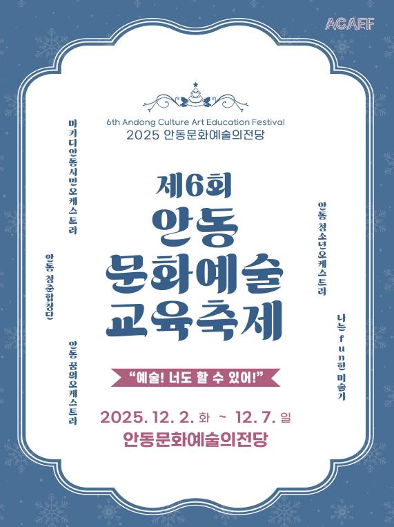 음악 프로그램에는 △12월 4일 19시 30분 ‘마카다안동시민오케스트라’ △5일 19시 30분 ‘안동 청춘합창단’ △6일 14시 ‘안동 꿈의오케스트라’△6일 19시 ‘안동 청소년오케스트라’가 참여한다. 각 단체는 약 10개월 동안 꾸준한 합주와 교육을 거쳐 완성도 높은 무대를 준비해 왔으며, 오케스트라와 합창이 어우러진 풍성한 정기연주회를 안동문화예술의전당 웅부홀에서 선보일 예정이다.