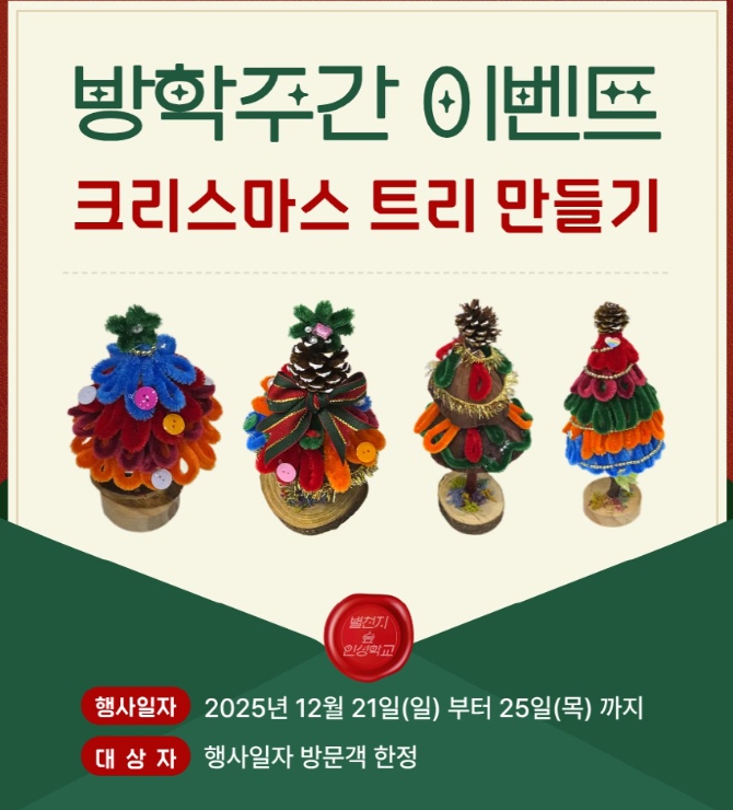 먼저 이달 21일부터 25일까지는 연밥과 솔방울, 색실 등 자연 재료를 활용해 크리스마스트리를 만드는 활동이 진행된다.