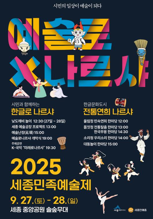 조성환 예술감독(세종민예총 지회장)은 “예술인과 시민이 함께 자연스럽게 어울릴 수 있도록 이번 행사를 준비했다”며 “세종시만의 지속가능한 문화예술 축제로 자리매김할 수 있도록 더욱 노력하겠다”고 전했다.