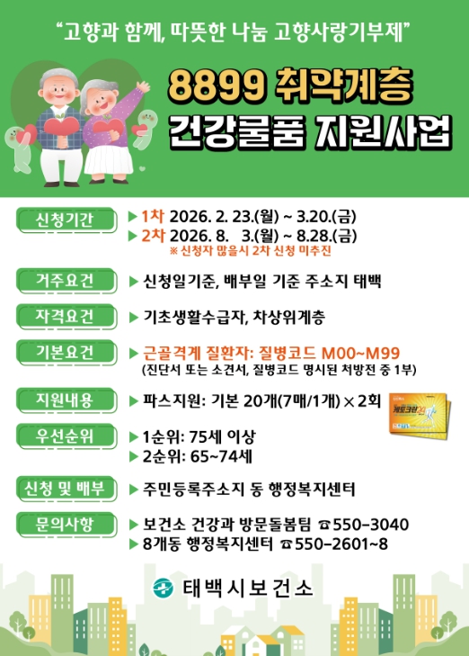 지원 대상은 태백시에 거주하는 65세 이상 어르신 중 기초생활수급자 및 차상위계층이며, 지원 품목은 근육통·관절통 완화에 효과가 있는 파스 20개(7매/1개)이다.