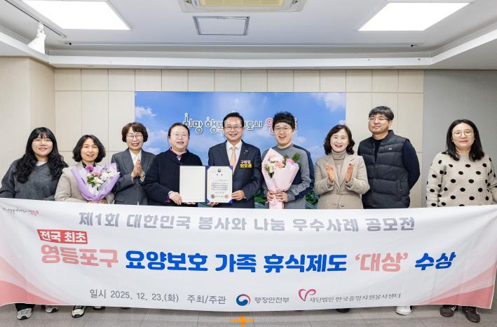 최호권 영등포구청장은 “이번 수상은 현장의 실질적인 필요에서 출발해 지역이 함께 만들어 온 돌봄 정책의 성과”라며 “앞으로도 어르신에게 따뜻한 안정을, 돌봄 가족에게는 일상의 휴식을 제공하는 지속 가능한 지역 돌봄 모델을 확산해 나가겠다”라고 전했다.