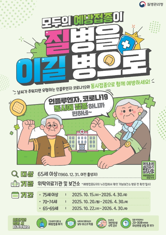 △75세 이상 어르신(1950. 12. 31.이전 출생자)은 10월 15일, △70~74세 어르신(1951. 1. 1.~1955. 12. 31.출생자)은 10월 20일, △65~69세 어르신(1956. 1. 1.~1960. 12. 31.출생자)은 10월 22일부터 접종 받을 수 있다.