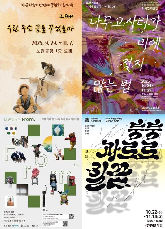 상계예술마당에서는 10월 22일부터 11월 14일까지, 2025 노원 시각예술지원사업 전시지원 부문 선정 작가들의 4인전 '둥둥파르르힐끔'이 열린다.