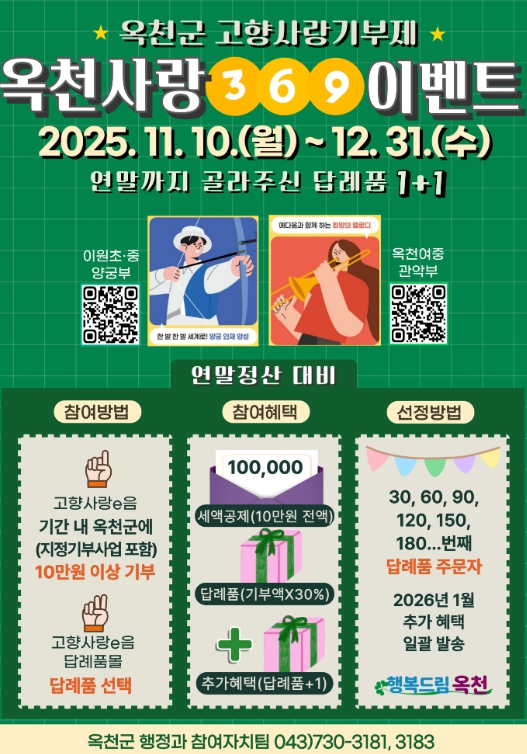 '옥천사랑369 이벤트' 참여 방법은 11월 10일부터 12월 31일까지 고향사랑e음, 은행 어플(국민, 기업, 신한, 하나, 농협) 또는 전국 농협은행(방문)에서 옥천군 또는 지난 10월 모금을 개시한 특정사업 '옥천군 예체능 꿈나무 지원'에 10만 원 이상 기부하고 답례품 선택까지 완료하면 된다.