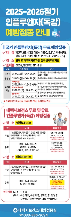 이번 조치는 예년보다 독감 유행이 빨라질 것으로 예상됨에 따라 시민 건강 보호를 최우선으로 한 결정으로, 예방접종은 위탁 병·의원, 태백시보건소, 철암보건지소에서 순차적으로 실시된다.
