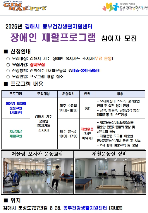 재활프로그램 관련 문의는 김해시 동부건강생활지원센터 재활운동실로 하면 된다.