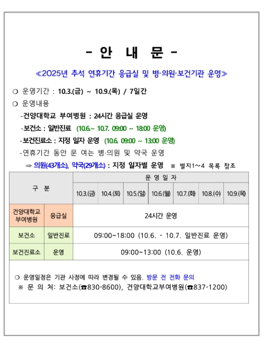 연휴 기간에는 지역응급의료기관인 건양대학교 부여병원 응급실이 24시간 운영되며, 관내 병의원 43개소와 약국 29개소를 ‘문 여는 병의원과 약국’으로 지정·운영하여 진료 공백을 최소화할 계획이다.