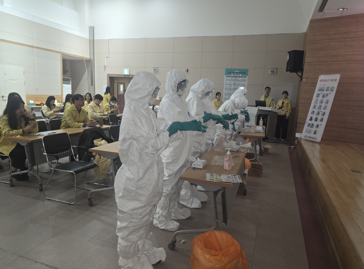 교육 후 진행된 모의훈련에서는 Level-D 개인보호복 착·탈의 실습을 통해 오염 방지 절차를 반복 숙달하고, 현장에서의 안전성과 감염 차단 능력을 강화했다.