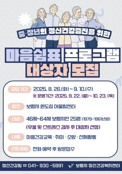 ‘마음쉼표 프로그램’은 9월 22일부터 10월 23일까지, 매주 월요일과 목요일 보령 원도심 어울림센터에서 총 8회기로 진행된다.