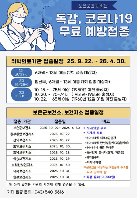 예방접종은 사전 예약 없이 가까운 지정 의료기관에서 가능하며, 신분증을 반드시 지참해야 한다. 보은군보건소에서는 오는 29일부터 예방접종을 실시할 예정이다.