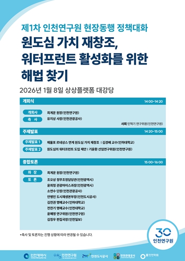 주제발표는 ▲인천학회 김경배 회장이 “제물포 르네상스 연계 원도심 가치 재창조”, ▲인천연구원 기윤환 선임연구위원이 “원도심의 워터프런트 도입 제안”을 주제로 진행한다.