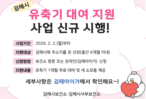 김해시 관계자는 “유축기 대여 사업은 산모들이 초기에 겪는 수유의 어려움을 실질적으로 도와주는 정책”이라며, “앞으로도 아이 낳고 키우기 좋은 따뜻한 행복도시를 만들기 위해 다양한 모자보건 사업을 발굴해 나가겠다”고 말했다.