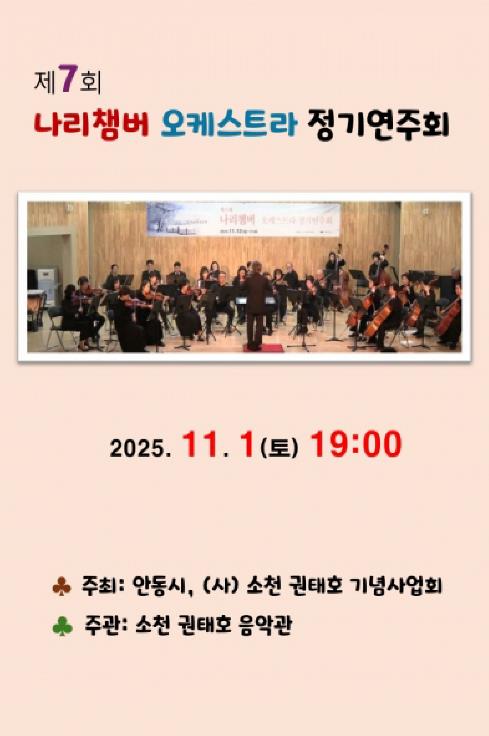 이번 연주회는 한 해를 마무리하는 시점에서 안동시민에게 따뜻한 클래식 선율로 위로와 감동을 전하고자 마련된 무대로, 현악 중심의 실내악 오케스트라 ‘나리챔버오케스트라’가 출연해 다양한 장르의 명곡을 선보인다.