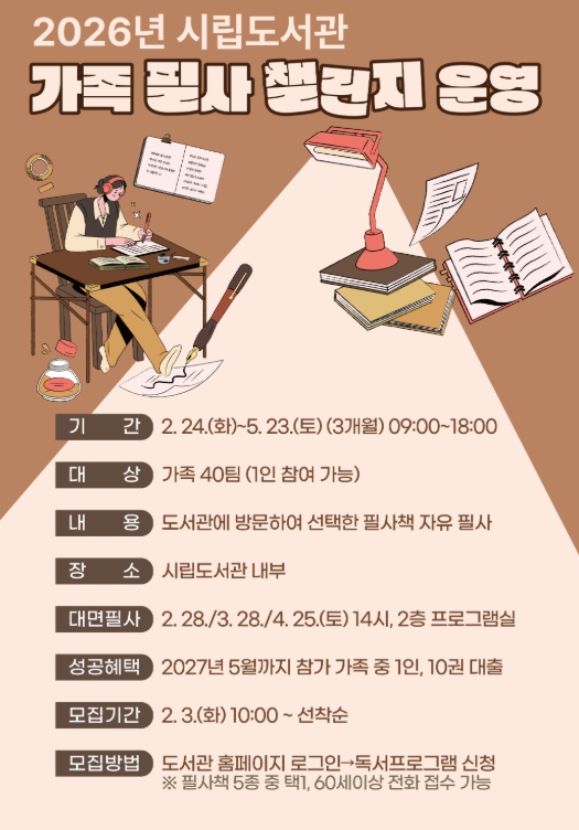 참가자 모집은 2026년 2월 3일 오전 10시부터 도서관 홈페이지 독서프로그램 신청 메뉴를 통해 진행되며, 참여를 원하는 필사책을 선택해 신청하면 된다.